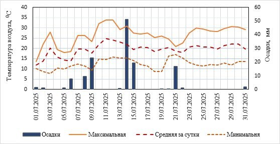 Июль 2025 года порадовал долгожданным теплом. Столбик термометра поднимался до 33.9 °C (11–12 июля). Средняя температура воздуха составила 19.6 °C, на 1.7 °C выше нормы. В первой декаде ещё сохранялась прохладная погода с минимальной температурой 7.8 °C (3 июля). Вторая декада характеризовалась тёплой и умеренно дождливой погодой. В третьей декаде температура была стабильно тёплой с небольшим количеством осадков. Вода нагрелась, и массовые купания проходили повсеместно. Осадков в июле выпало 134.7 мм, что превысило норму на 42%. Максимальное количество за сутки (14 июля) составило 51.0 мм – почти половина месячной нормы. Выпавшие дожди в июне-июле способствовали повышению уровней воды. Наблюдалось прохождение волны дождевых паводков на водных объектах. На графике метеопоказателей июля показана максимальная, средняя и минимальная температура воздуха, а также количество осадков.